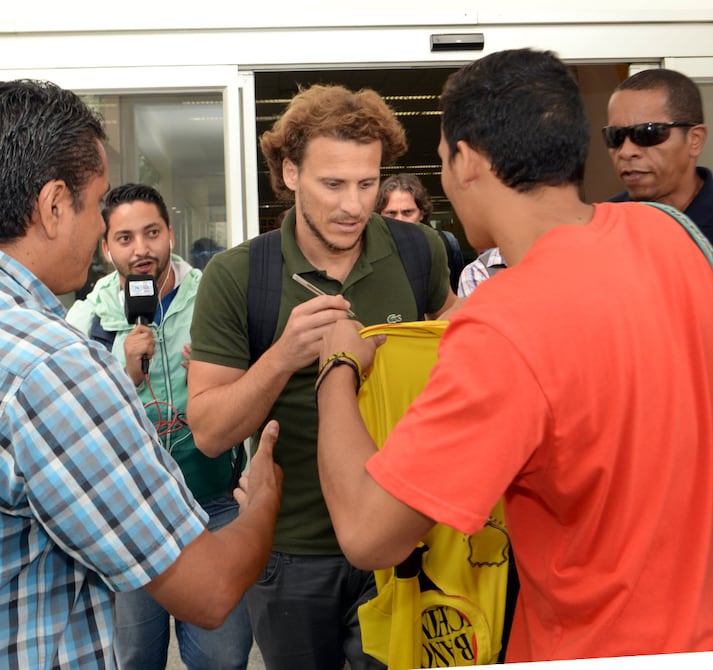 Cerca del medio día de este miércoles, arribó a Guayaquil el delantero uruguayo Diego Forlán que esta tarde ofrecerá una rueda de prensa para la Noche Amarilla de Barcelona, que será este viernes en el estadio Monumental.