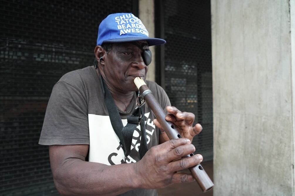 Guillermo Hidalgo acerca su teléfono celular al ojo derecho para poder visualizar la pantalla, colocar las canciones que reproducirá en YouTube y así escucharlas en sus audífonos para guiarse en los acordes que tocará con la quena.