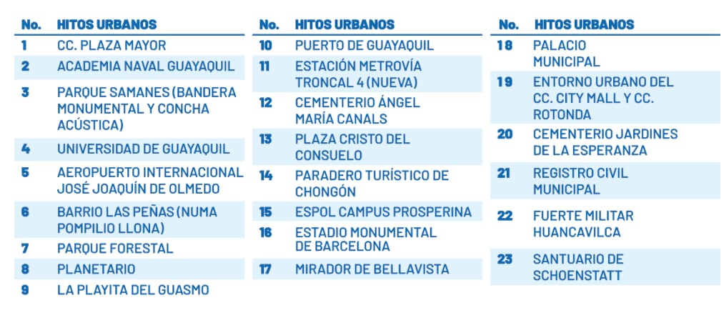 El mapa a color mide abierto 90 x 59 cm; en la parte superior izquierda hay un zoom al sector de vía la costa, en la parte superior derecha está un zoom al centro de la ciudad y en la parte central está el mapa completo con una franja inferior donde están 113 hitos urbanos de la ciudad, que van desde instituciones educativas, parques, aeropuertos, terminales terrestres, zoológicos, áreas verdes, avenidas principales, hospitales, puentes, sectores representativos y algunos sitios de interés turístico.